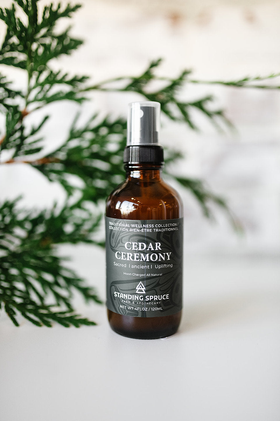 Crafted to deliver a captivating experience, our Cedar Ceremony Smudge Spray provides a remarkable alternative for those who possess aversions to smoke .Our mist effortlessly infuses any space with the alluring scent of cedar, symbolizing the strength and protection held within our forests.